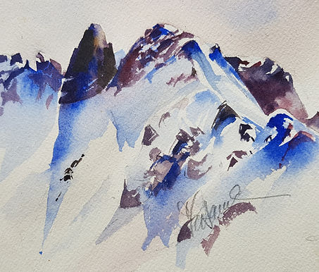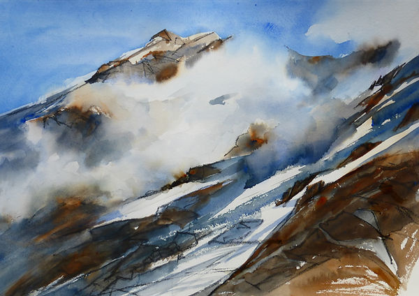 La montagne est mon terrain de jeu préféré, l’âpreté des roches, des falaises, la douceur des brumes et brouillards, de la neige, l’énergie des torrents des cascades, les toits serrés des villages, les lumières changeantes, les chocards en plein vol, tout peut devenir le sujet d’une peinture à l’aquarelle